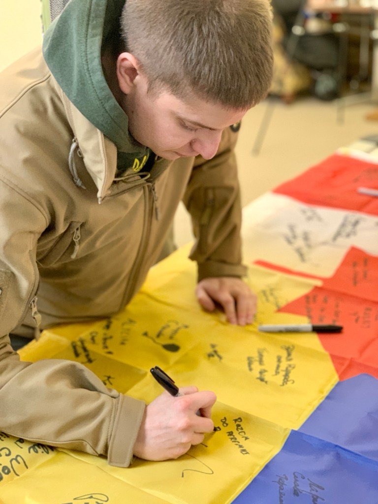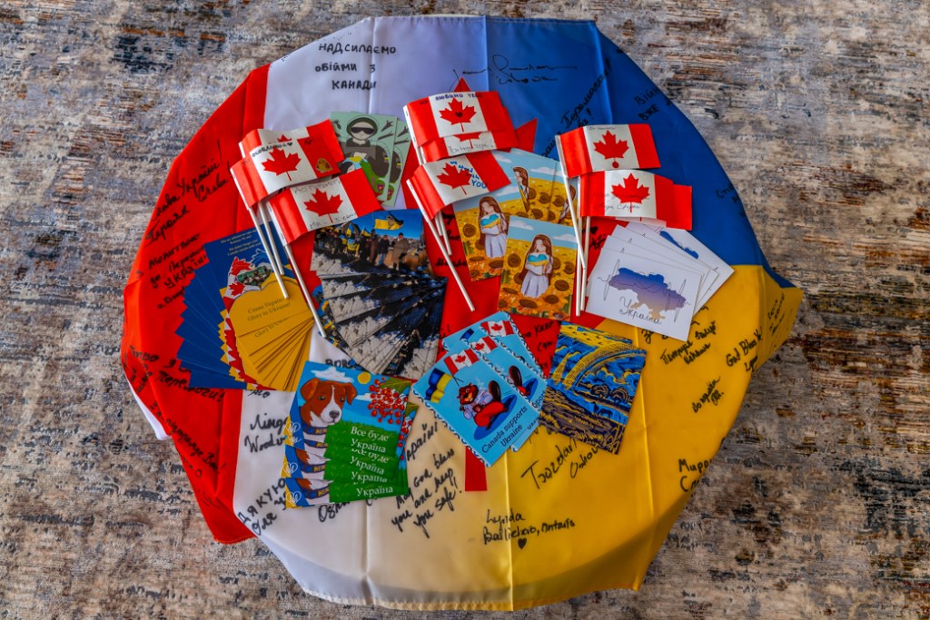 After a three-month long journey, the signed – with love – Canada/Ukraine flag and postcards have arrived at the 93 Brigade. The outpouring of love and support from Canada so warmed the hearts of Defenders that some tears flowed.