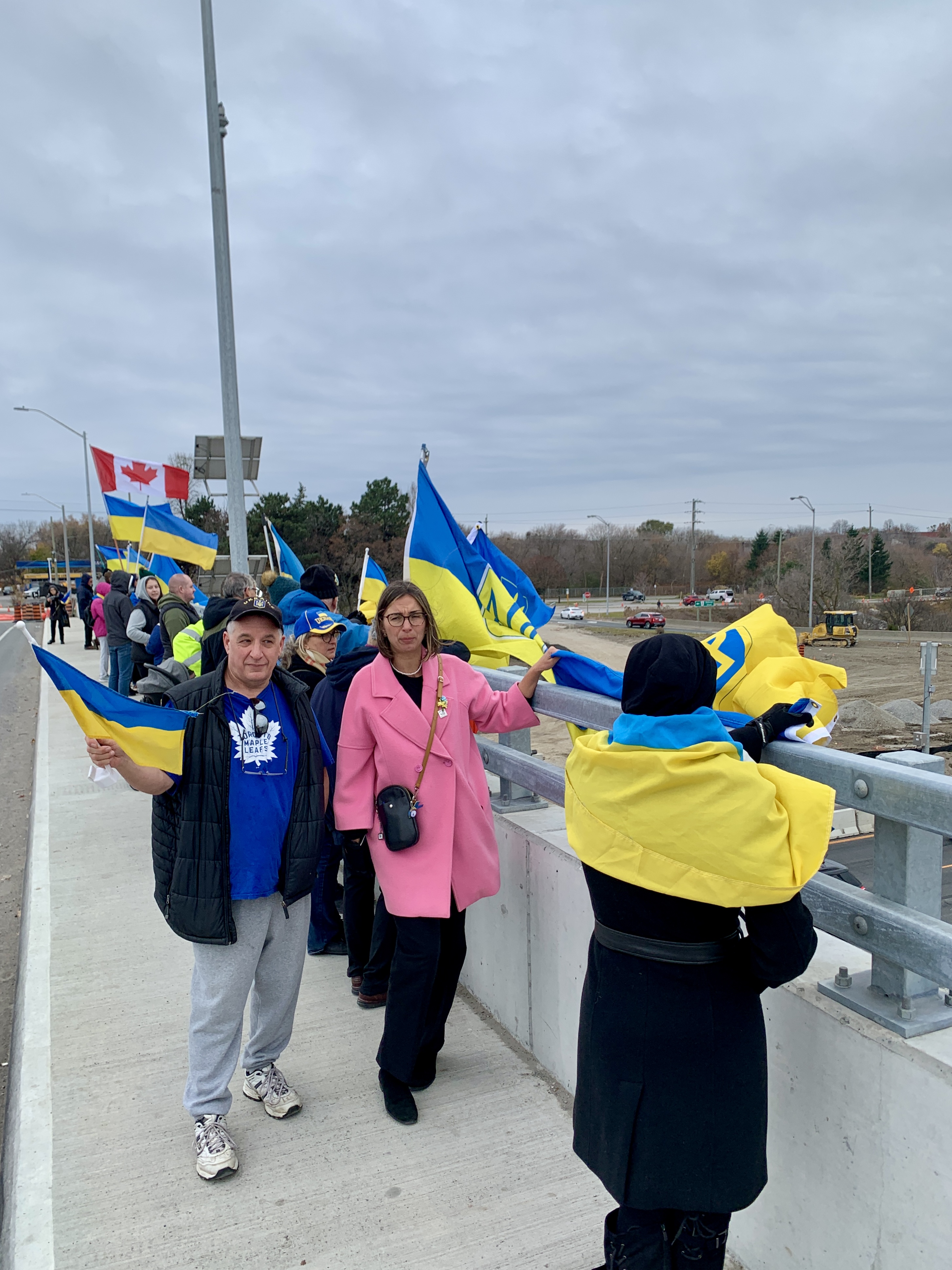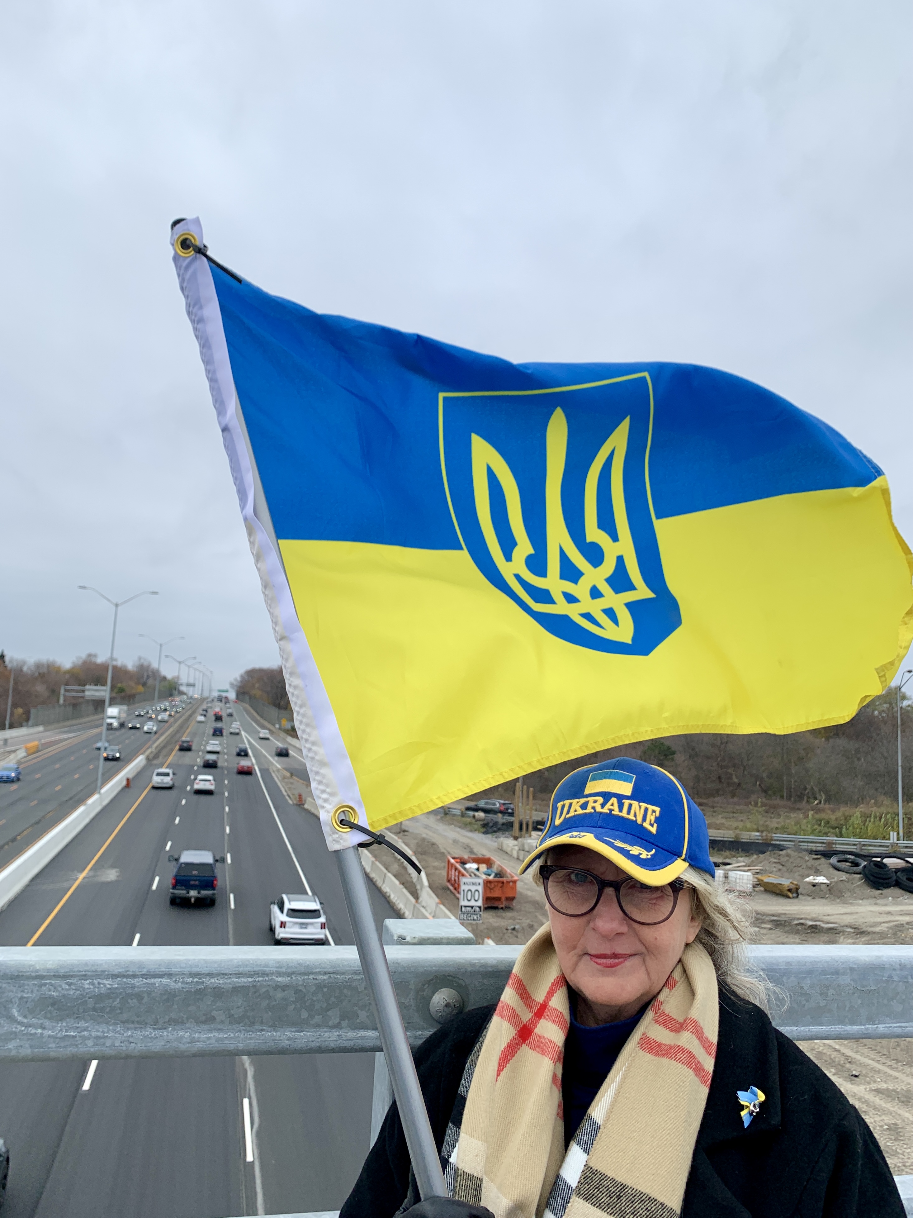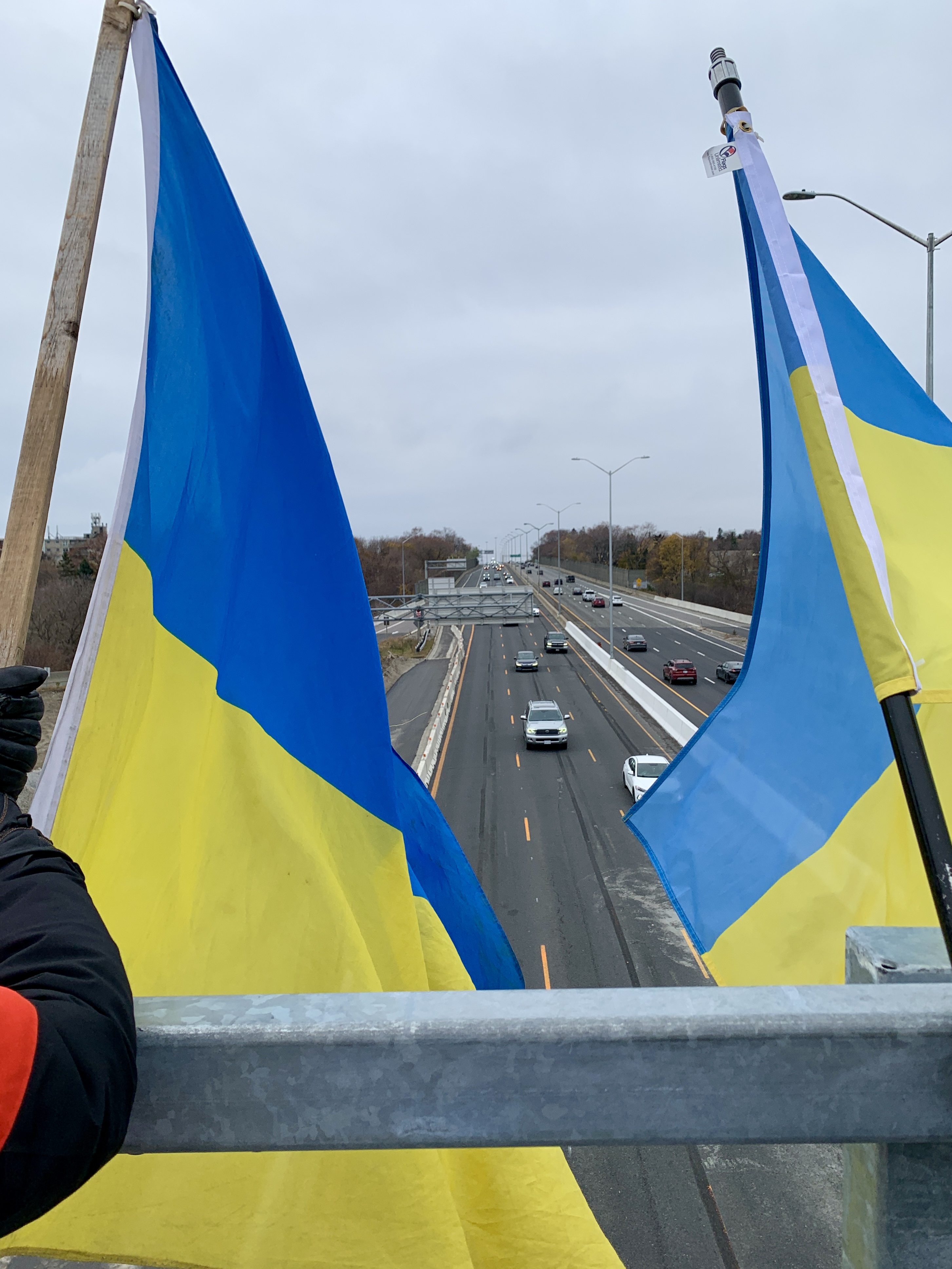 Each week since the invasion, local folk have demonstrated at the 401 bridge in support of Ukraine. It’s a perfect spot, with thousands of vehicles passing under. Many honk their horns in support of the Ukrainian and Canadian flags that drivers see as they travel past.
