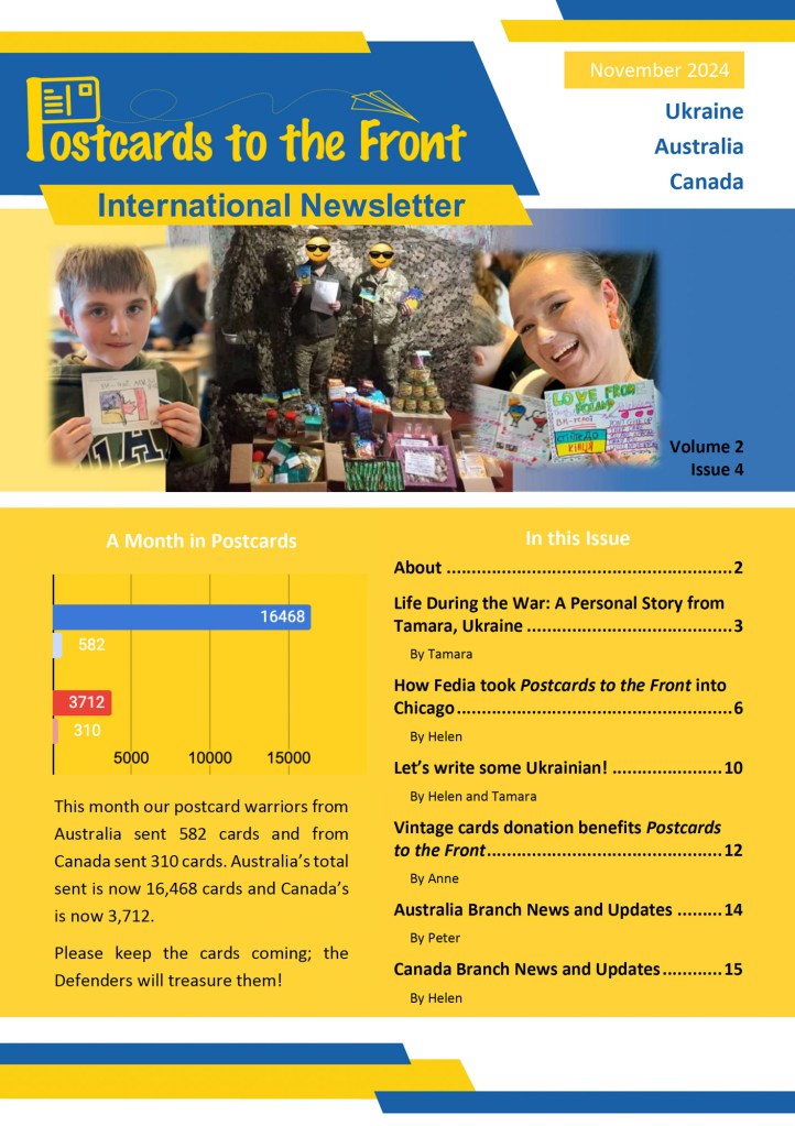 Our November 2024 newsletter is now available to you to read. You will read Tamara’s update on her situation in Ukraine. We have some new Ukrainian phrases for you to use. Especially, as we are now encouraging cards to arrive at the front lines in time for the 3rd anniversary since the invasion – February 24th.