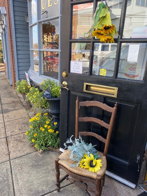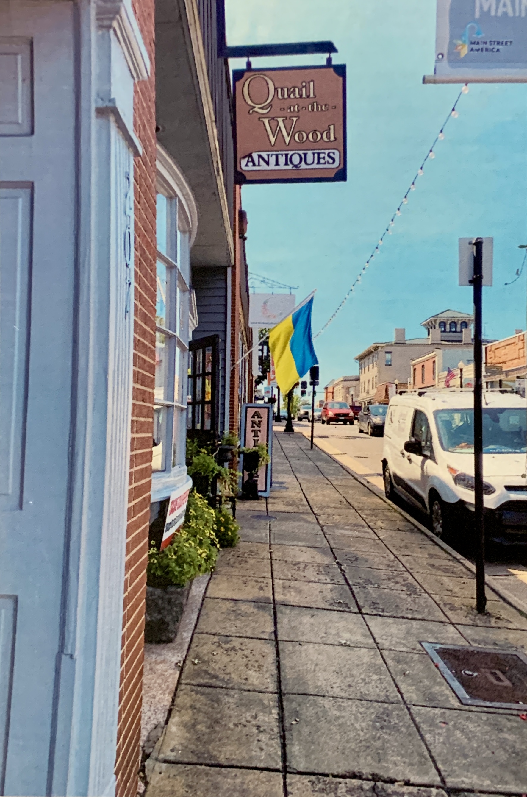 The Ukrainian flag has flown outside Sarah’s shop since right after the full-scale invasion of Ukraine in February 2022. She’s replaced the flag four times, as weathering tatters and fades it. Sunflowers are the theme woven from the outside to inside her shop, as a symbol of support for Ukraine’s courage and resilience.
