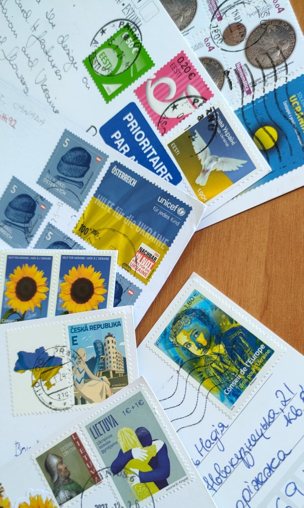 Nadia finds solace in the supportive postcards that she receives from all over the world. After she joined Postcrossing in late 2022, she “was pleasantly surprised by how many people support Ukraine. Before that, it seemed to me that we Ukrainians were alone with the enemy. And this war is only our burden. But the cards with words of support changed my mind. I realized that the world is not indifferent to what is happening in Ukraine. And this support gave me strength and courage not to give up and move on.”