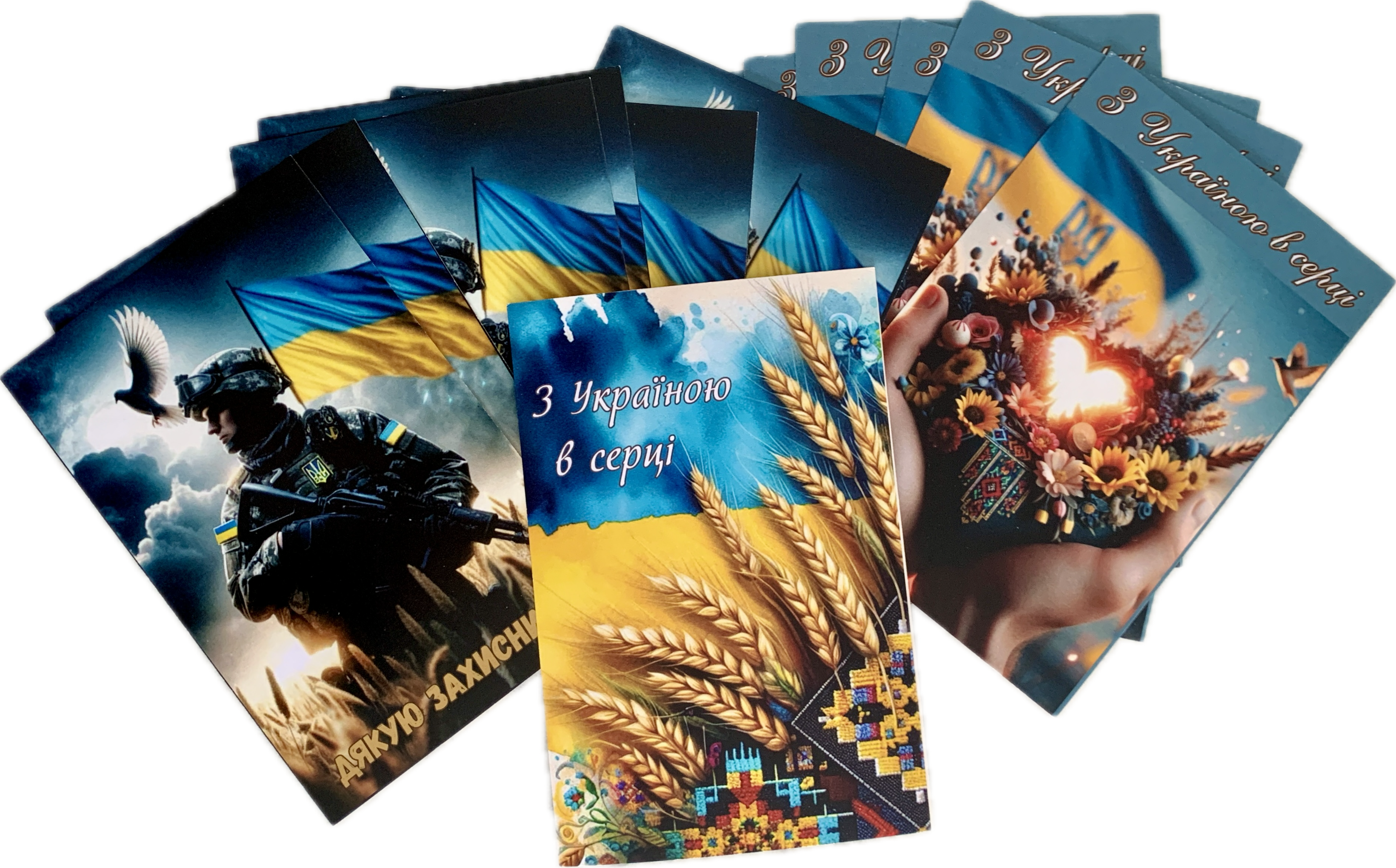 Then, in September, he explained, “I saw a post by Angela in a Facebook group supporting Ukraine, advertising the postcard initiative (Russia Embassy protesters). I asked who within my group of friends were interested to send a batch of postcards and got some positive feedback. We started to brainstorm a few ideas on the type of postcards to use, and my friend Svitlana K. suggested that we make our own. She took it upon herself to come up with a variety of designs which either highlighted aspects of Ukrainian culture, had a military focus, or that demonstrated support from Canadians. She found a local printer and we were quite satisfied with the quality and cost, so we proceeded. In the end, we had eight people writing a few cards: Svitlana, her two children Yeva and Sviatoslav, friends Kate and Oleg, a kind couple Svitlana met at the Ukrainian church, and me.”