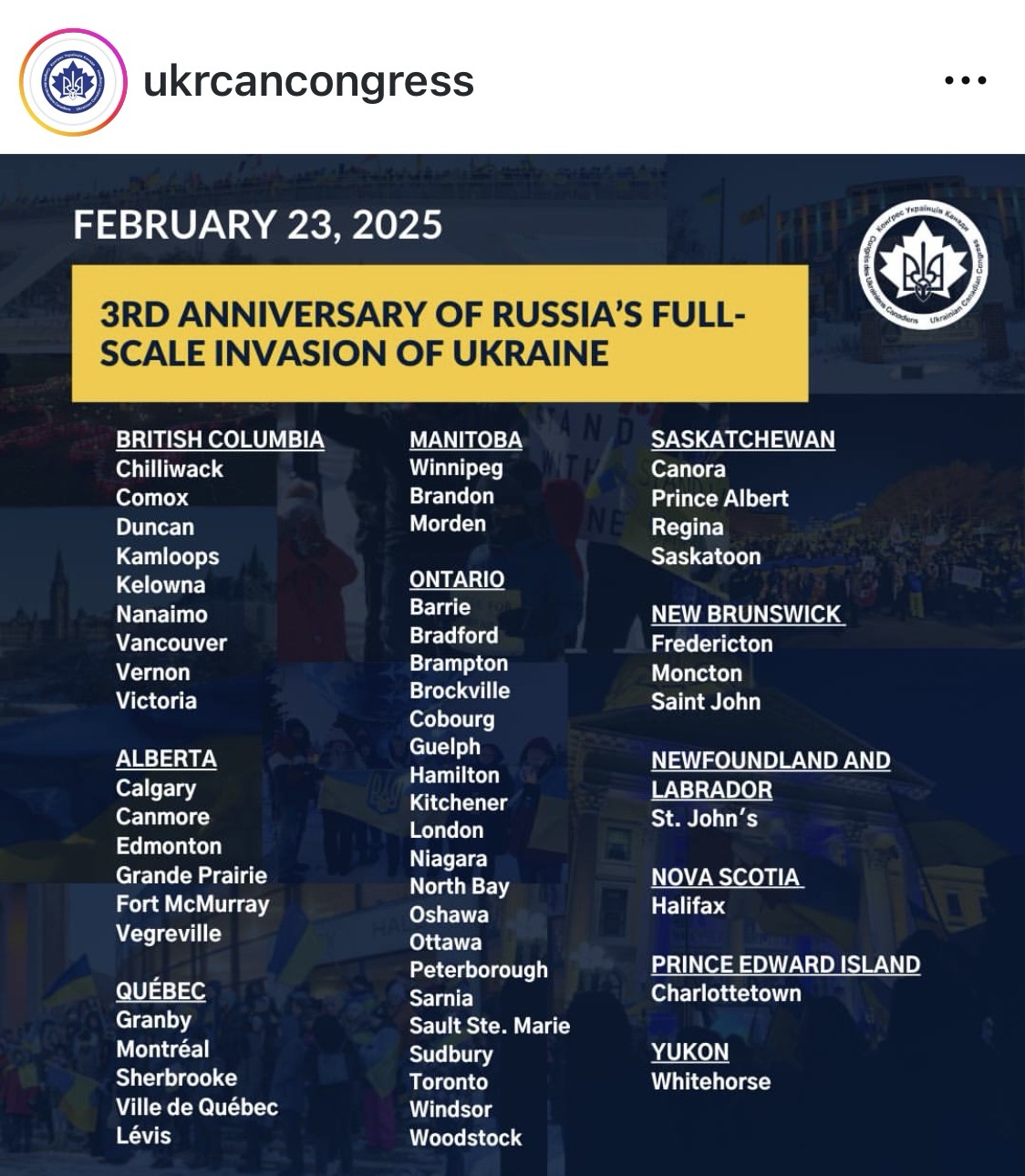 The Ukrainian Canadian Congress has posted locations of rallies being held Sunday, February 23.
