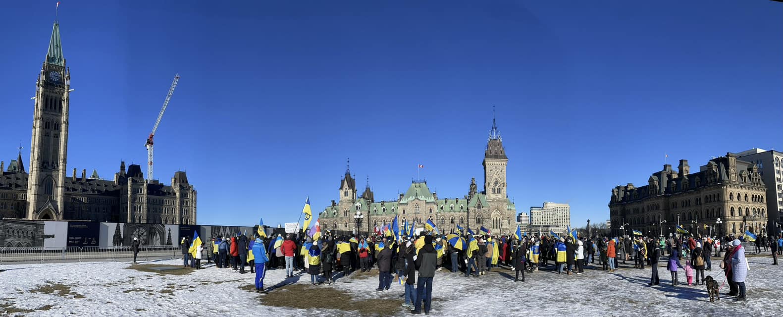 In February 2024, Brigitte joined the rally at Parliament Hill in Ottawa to mark the two-year anniversary of the full-scale invasion of Ukraine. “There were a lot of Ukrainian people, and it was very emotional. They were wearing flags and had posters that said ‘make russia pay’, among others.” (Photo courtesy of Russia Embassy Protesters / Facebook page)