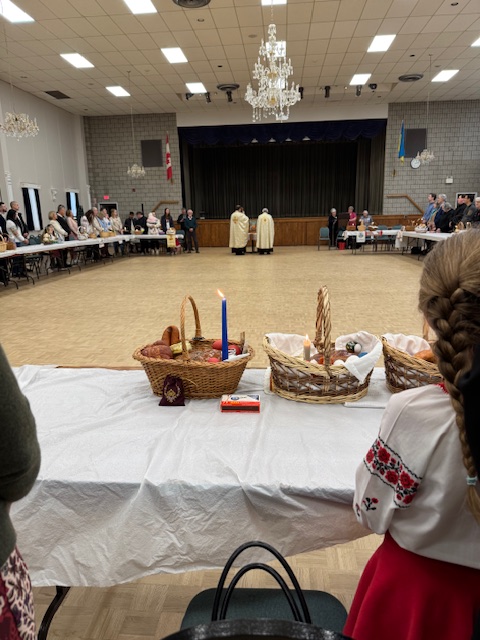 Ukrainian families in Oshawa, Ontario observed the practice of blessing Easter food on Holy Saturday (April 19, 2025). Father Bohdan Bilinsky and Father Dmytro Hancharyk blessed more than a hundred baskets brought to St. George’s Ukrainian Catholic Parish Hall. The Fathers reminded the parishioners of the sacrifices made by Ukrainian Defenders and encouraged all to write postcards to express our support.
