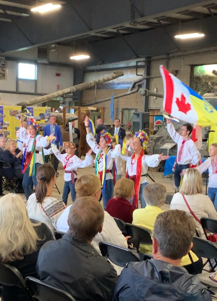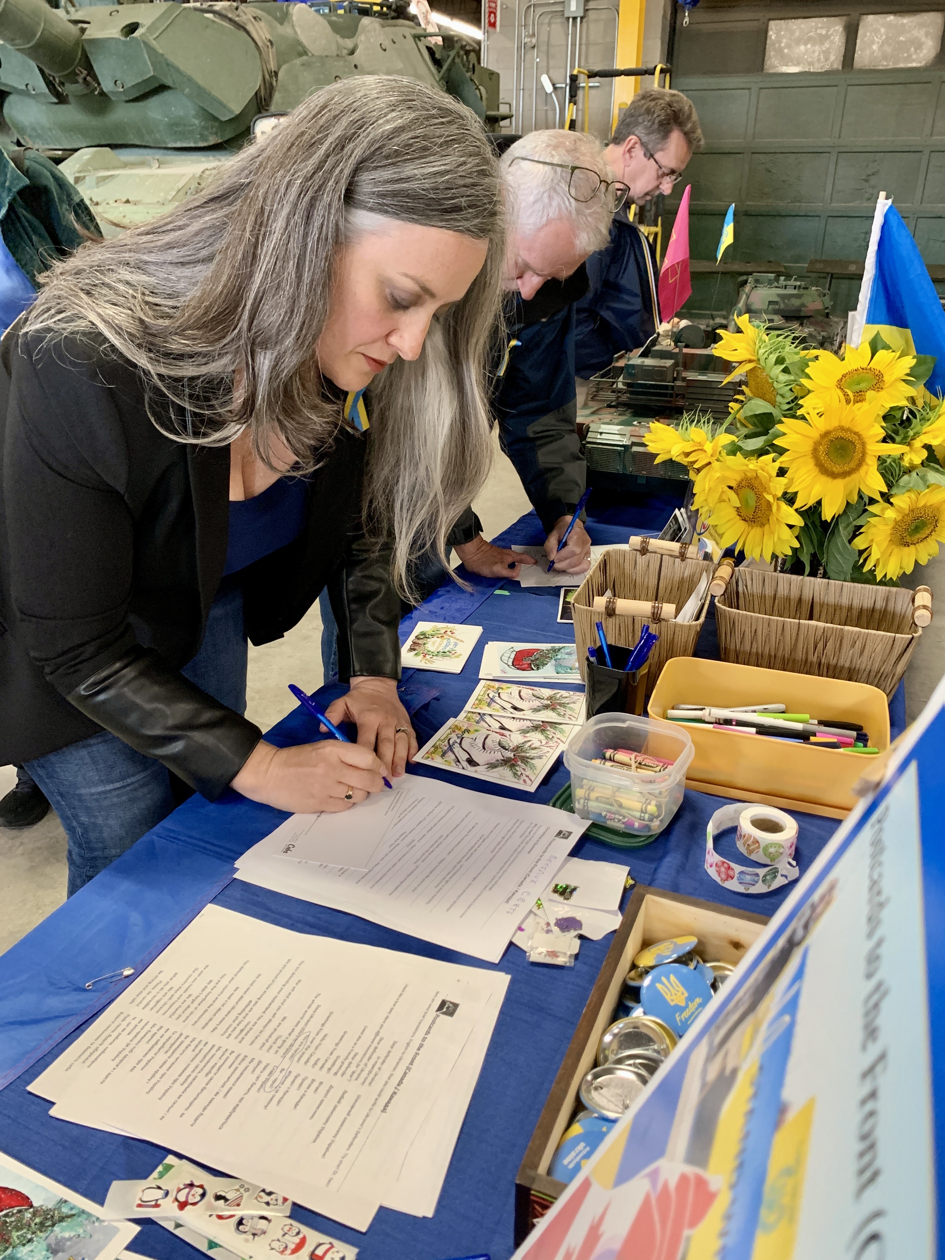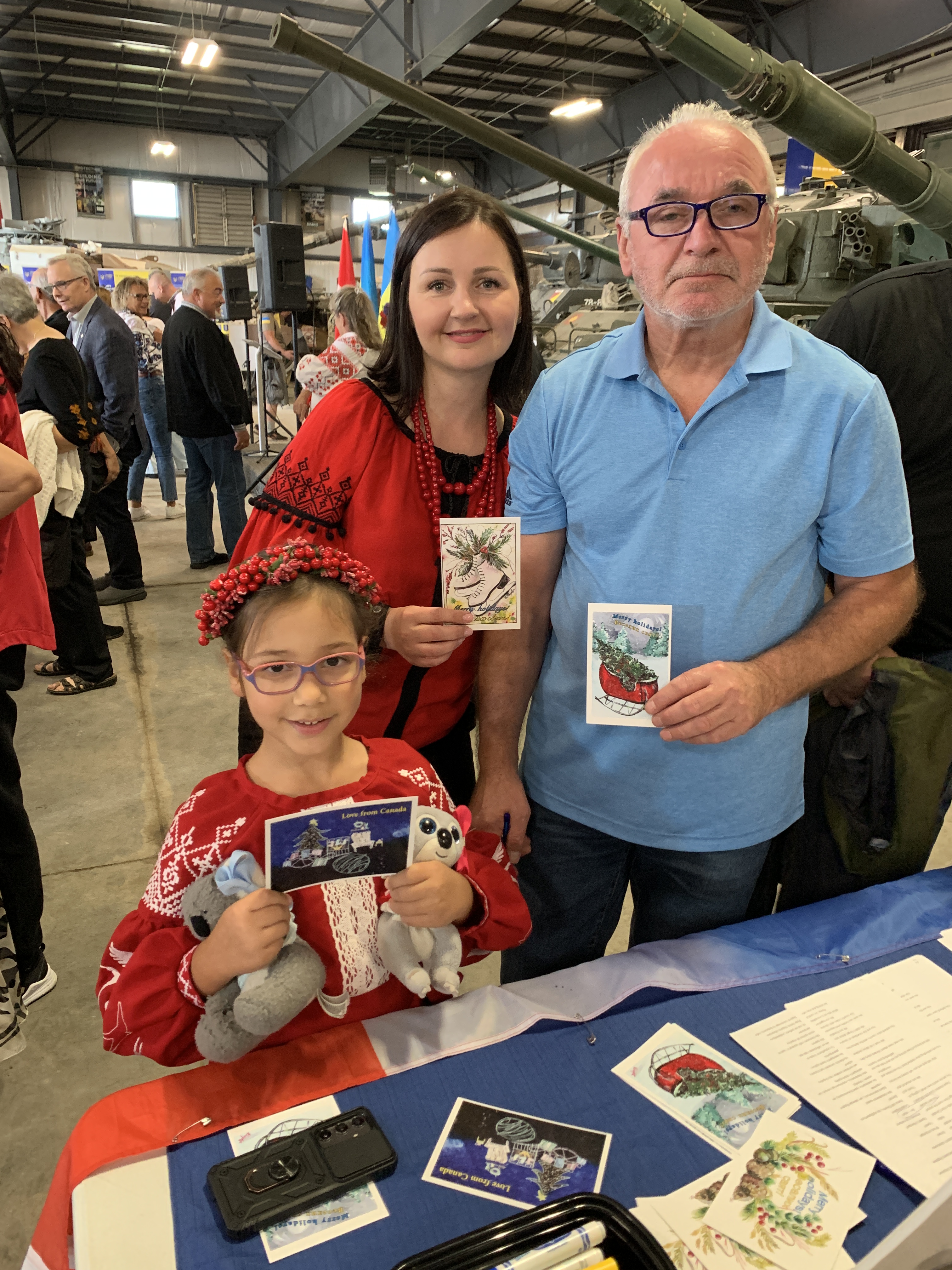 Top row: Odesa Ukrainian Dancers; Mia & Oleh Nikolenko: Consul-General of Ukraine to Canada in Toronto; 231 guests. 2nd row: Nana; Tridents & Tanks poster; Mia with pictures for Colonel Andrii Shmilyk: Military Attaché, Armed Forces of Ukraine to take back to Ukraine’s Defenders. 3rd row: Rhonda Kirkland, MP Oshawa; Jennifer K. French, MPP Oshawa; Robert Chapman, Deputy Mayor Oshawa; Ruslan Kurt, installation artist. Bottom row: Al Duffy, President of Canadian Tank Museum Board; postcard-writers.