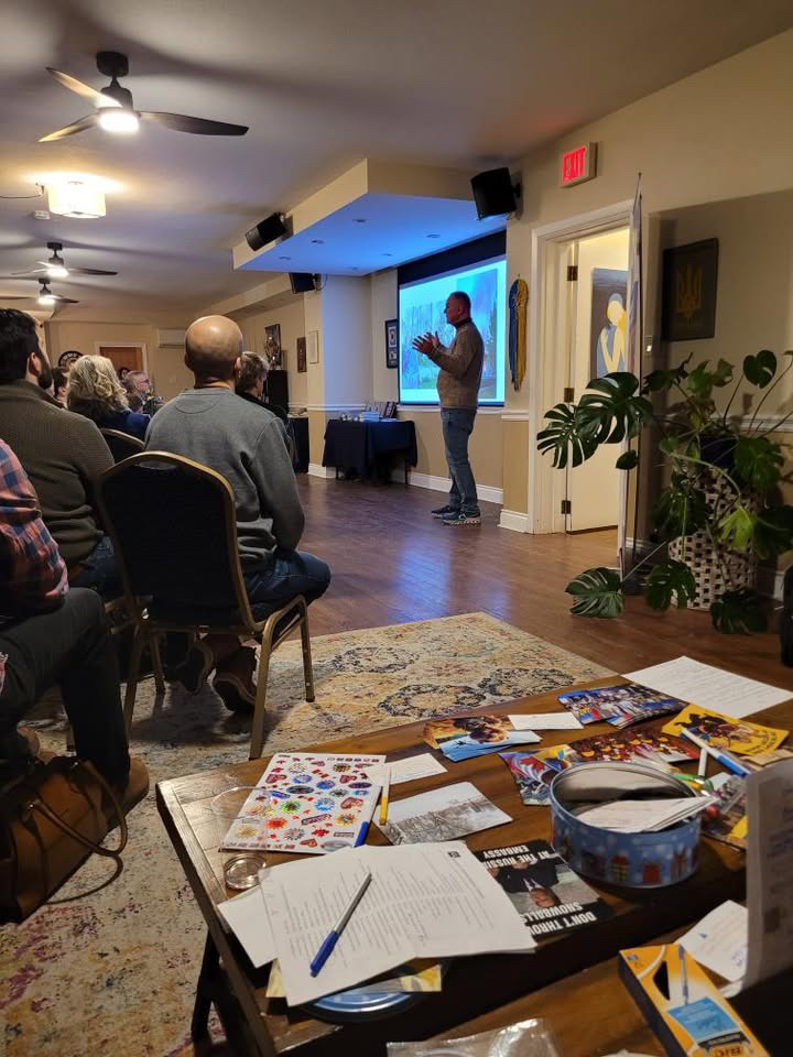 The russian embassy protesters organized a special event after the Parliament Hill gathering in support of Ukraine that featured guest speaker Juris Ulmanis, Latvian academic, entrepreneur, mountaineer, polar explorer and active volunteer supporting Ukraine. During past visits to Canada, Juris has joined the rep’ers to march the pavement outside the russian embassy and has written postcards to Defenders for this project. Presently, Juris focuses his attention on the evacuation of injured Defenders from the front lines to Latvia to receive medical care. After his talk about Latvia’s contributions to support Ukraine, attendees wrote postcards that Juris will take back to Latvia to distribute amongst Defenders in hospitals there.