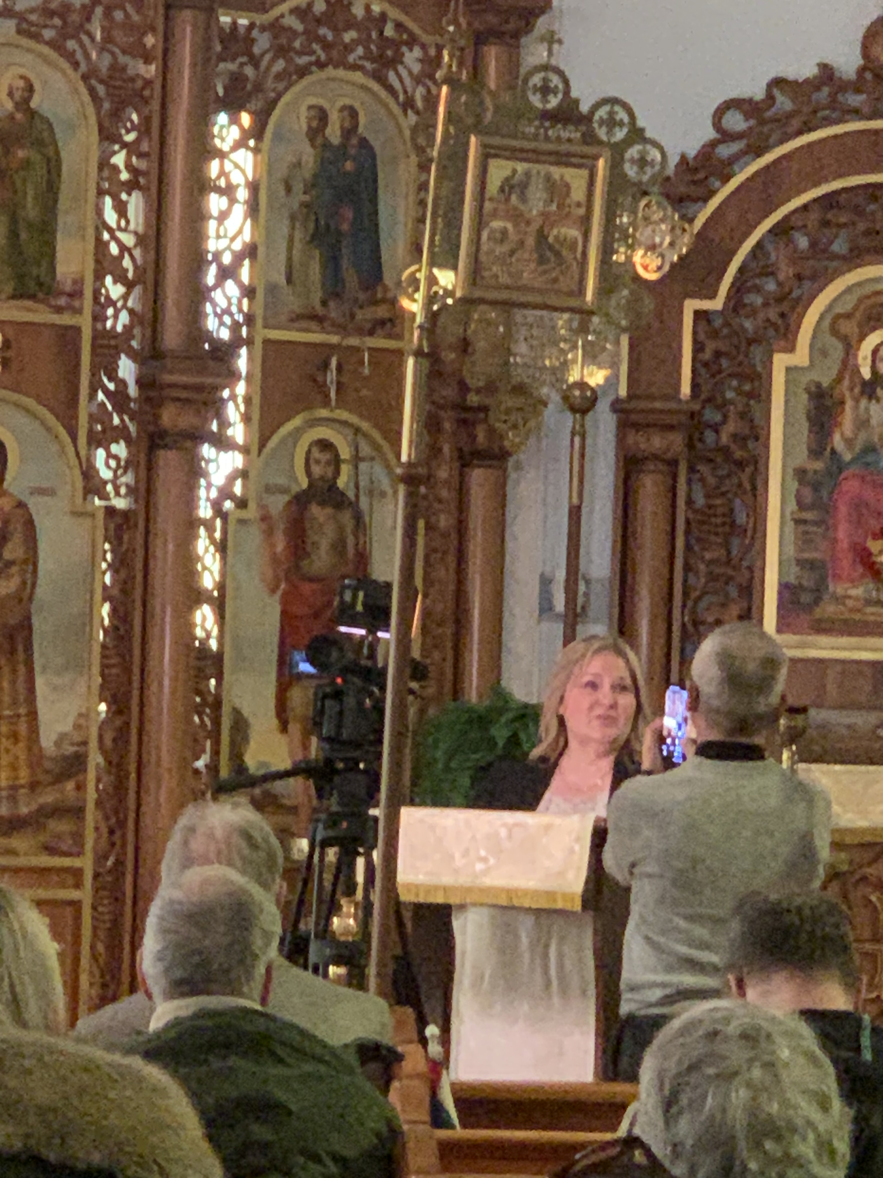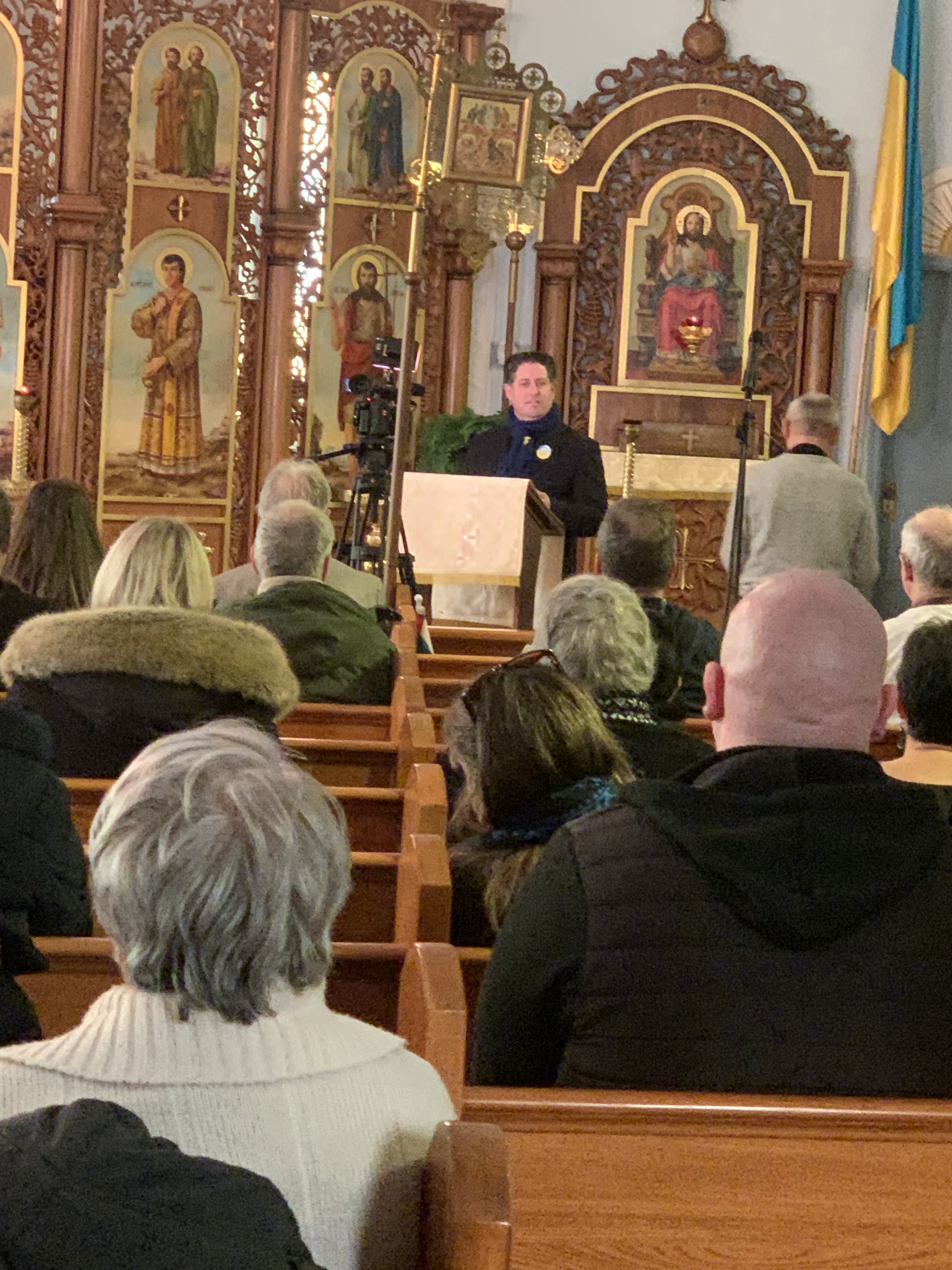 Our local community, Oshawa Stand with Ukraine, gathered at the Albert Street bridge over Highway 401 with many from the community attending, as they have every Sunday since the full-scale invasion four years ago, then trekked over to St. John the Baptist Ukrainian Orthodox Church to pray for Ukraine and to write postcards to Defenders. Local politicians from all levels of government once again showed their support for Ukraine, as we have reported in past articles, demonstrating sustained support for Ukraine within the community, and amongst all levels of government officials.